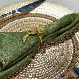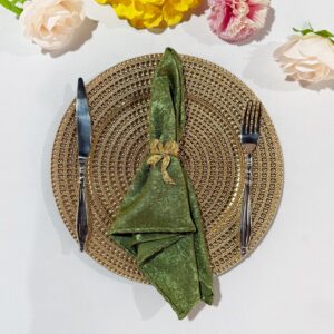 Embrace the allure of understated luxury by incorporating willow green shimmer napkins into your table decor. Offset the darkness of the willow green shimmer napkins with vibrant floral arrangements as centerpieces in contrasting colors such as white, red, or pink to create a stunning visual impact. 20″x20″ Silver Shimmer Napkin is also available for added flexibility in your table setting.