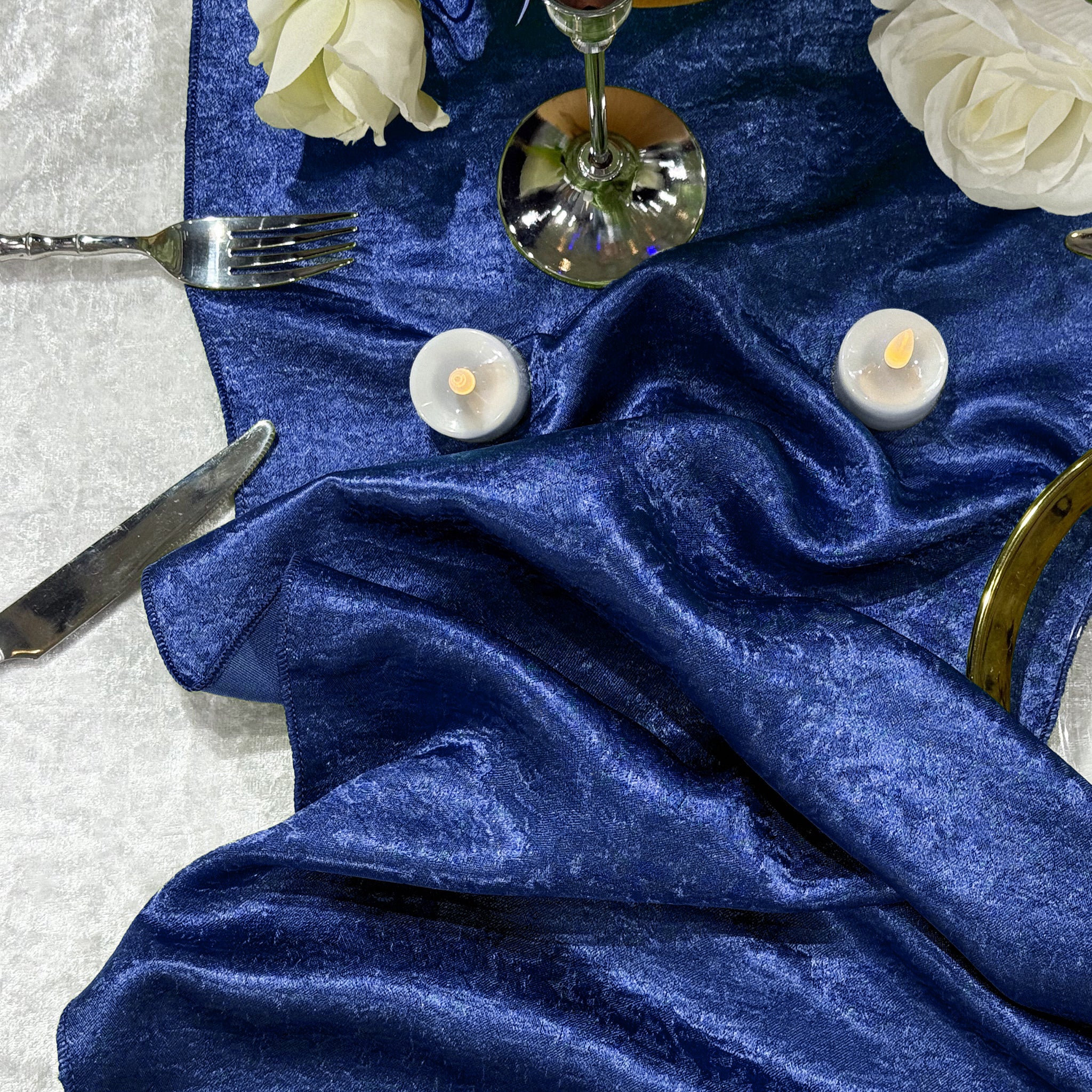 Premium quality crinkle shimmer table runner – royal blue designed for elegant event styling, perfect for weddings, parties, and professional décor setups.