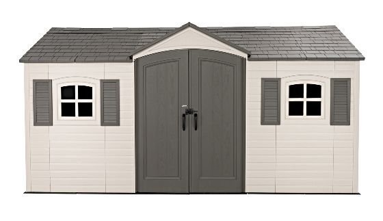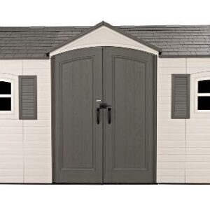 Lifetime 15×8 Legacy Series Outdoor Storage Shed 60465 Includes: (6) skylights, (2) windows, (2) screened vents, (1) standard door set, (1) Slide Bar Latch, (2) Deadbolts, (2) 90″ fold in half, height-adjustable wall shelves, and Fold in half shed floor (foundation not included). Constructed of double-wall, High-density Polyethylene (HDPE) and black powder-coated steel. Made in USA with US & Imported Parts with a (10)-Year Limited Warranty. Packaging contains (1) shed unit and all necessary hardware. Assembly REQUIRED. Roof Color: Dark Gray (Carbonized Gray) Wall Color: Tan (Desert Sand) Door Color: Brown (Roof Brown) Floor Color: Black Powder Coat Color: Black.
