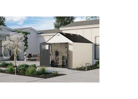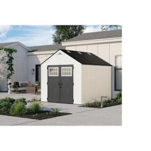 The 8 ft. x 10 ft. Tremont Storage Shed by Suncast can tackle all of your storage needs. With its trend-forward color palette, this shed is perfect to update any backyard. The reinforced resin floor is built to withstand heavy loads, such as lawnmowers, tractors, and other large outdoor equipment. In addition, utilize every inch of space with the included standard corner shelves. Built-in skylights allow natural light to come in making it easier to locate items during the daytime. The large double-door entryway provides easy access to your belongings and is equipped with pad-lockable metal handles to keep them safe and secure (lock not included). Constructed of metal reinforced, multi-wall resin panels, this sturdy shed is weather-resistant and easy to maintain from season to season.